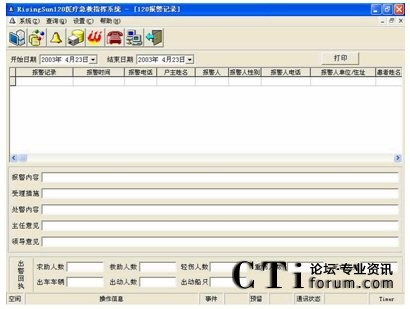 指揮中心信息查詢系統(tǒng)基于客戶/服務(wù)器方式。支持全中文檢索及模糊查詢、組合條件查詢、記錄瀏覽查詢、綜合查詢、提供指揮中心與信息中心間數(shù)據(jù)的雙向數(shù)據(jù)流動等功能。還可對120相關(guān)信息進(jìn)行錄入、分類、保存、歸檔、管理維護(hù),并提供檢索及查詢、綜合匯總、報(bào)表生成、統(tǒng)計(jì)打印及發(fā)送給領(lǐng)導(dǎo)審閱等功能,并可跟蹤值機(jī)人員對120報(bào)警的受理急救、指揮的每一步驟的處理情況。