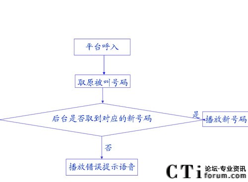 當(dāng)客戶申請(qǐng)了改號(hào)通知業(yè)務(wù)后,客戶將需要改號(hào)的手機(jī)設(shè)置呼叫轉(zhuǎn)移,將呼叫轉(zhuǎn)移到改號(hào)通知系統(tǒng)的接入號(hào)碼上,當(dāng)用戶撥打此客戶的舊號(hào)碼時(shí),系統(tǒng)取出該客戶的舊號(hào)碼所對(duì)應(yīng)的新號(hào)碼,以語(yǔ)音方式播報(bào)給主叫方,從而完成改號(hào)通知服務(wù)。例如:當(dāng)某用戶(手機(jī)、固定電話)撥打已做變更用戶的手機(jī)號(hào)碼時(shí)會(huì)得到類似如下語(yǔ)音提示:您好!您所撥打的手機(jī)號(hào)碼已改為XXX,請(qǐng)撥打新號(hào)碼。該語(yǔ)音可任意設(shè)置,還可以將該提示以短信形式下發(fā)到手機(jī)撥打用戶,且主叫方用戶不會(huì)產(chǎn)生任何費(fèi)用。