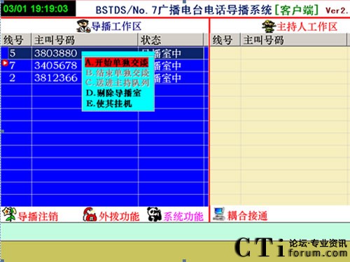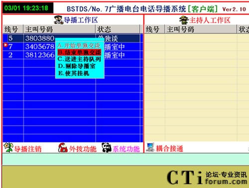 在上圖中,如想接通3803880的電話就出現(xiàn)了上述菜單,在上述菜單中有5種選擇,開始單獨(dú)交談、結(jié)束單獨(dú)交談、送進(jìn)主持隊(duì)列、剔除導(dǎo)播室、使其掛機(jī)。點(diǎn)擊[開始單獨(dú)交談]出現(xiàn)如下畫面: