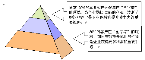 。。從抽象和通用的意義上講,多數企業(yè)的客戶價值分布是適合"二八法則"的,即20%的客戶創(chuàng)造了80%的利潤。但對每個企業(yè)而言,要洞察"究竟哪些客戶才是最有價值的客戶?""這些客戶在哪些方面的價值最大?""他們有什么共同的特征?"卻不是一件很容易的事。目前,多數企業(yè)的管理方式還停留在根據某一項或兩項單一指標(如銷售額或利潤)來作的客戶排行,無法進行多方位的綜合的客戶價值分析、管理。而要實現"以客戶為中心"的CRM理念,就必須建立一套全面的客戶價值評估管理系統(tǒng),并利用系統(tǒng)強大的數據分析、挖掘功能,快速地進行客戶群價值細分管理,建立起客戶價值金字塔。