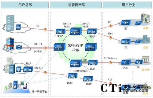 在政府、金融、能源、教育、商業(yè)連鎖等大客戶遠端機房,根據(jù)用戶不同類型的業(yè)務(wù)(數(shù)據(jù)、視頻、語音)配置相應(yīng)的轉(zhuǎn)換設(shè)備,如光纖收發(fā)器、V35協(xié)議轉(zhuǎn)換器、以太網(wǎng)協(xié)議轉(zhuǎn)換器、以太網(wǎng)/E1/V35光貓、PDH等,在運營商的模塊局/基站等接入機房部署MSAP機箱并配置相對應(yīng)的業(yè)務(wù)線卡,將遠端PDH、FE、V.35、語音等多種接入方式的多路業(yè)務(wù)匯聚后通過STM-1/STM-4等上行口與運營商傳輸網(wǎng)SDH/MSTP/PNT對接。在運營商中心機房,可以根據(jù)需要配置機箱式MSAP,匯聚后通過GE光纖接入用戶中心機房,也可以直接通過155M/622M/FE/GE光纖接入用戶中心機房,在用房中心機房配置MSAP進行協(xié)議還原,或直接接入用戶核心路由器的CPOS板卡上。這樣,就完成了整個專網(wǎng)業(yè)務(wù)的接入。