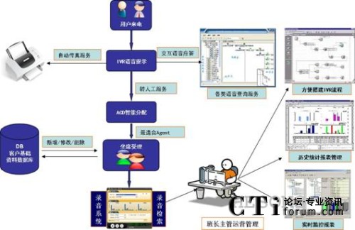 用戶電話呼入時(shí),系統(tǒng)通過自動語音應(yīng)答的方式,實(shí)現(xiàn)用戶服務(wù)的自動導(dǎo)航。交互式語音應(yīng)答功能自動播放問候和語音提示信息,根據(jù)用戶按鍵選擇提供自助服務(wù)或者呼叫中心人工服務(wù)。呼叫中心提供人工服務(wù)后還可以為特定的用戶需求提供人工轉(zhuǎn)IVR自動語音服務(wù),比如114查詢到電話、地址后,電信10000號呼叫中心提供的語音播放服務(wù)。
