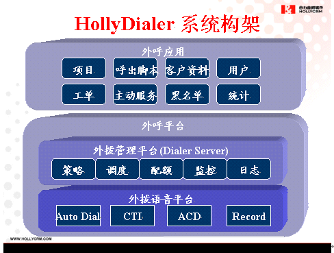 HollyContact是HollyCRM(合力金橋軟件)公司自主開發(fā)的CTI中間件產(chǎn)品,借鑒了國際上多家先進(jìn)而成熟的中間件產(chǎn)品設(shè)計思想,實(shí)現(xiàn)了呼叫中心CTI控制的全部功能,支持語音、傳真、短信、互聯(lián)網(wǎng)等多媒體的統(tǒng)一接入,具有混合排隊(duì)、智能路由、負(fù)載均衡的先進(jìn)體系結(jié)構(gòu)設(shè)計。HollyContact是基于COM技術(shù)的完全模塊化設(shè)計,向應(yīng)用層提供標(biāo)準(zhǔn)的開發(fā)程序接口,應(yīng)用于支持CSTA國際標(biāo)準(zhǔn)通訊協(xié)議的呼叫中心系統(tǒng)平臺, 具有統(tǒng)一排隊(duì)、智能路由、語音數(shù)據(jù)同步、 豐富的桌面應(yīng)用、 自動人工互轉(zhuǎn)、 系統(tǒng)監(jiān)控、 統(tǒng)計分析、 雙機(jī)熱備等功能。
