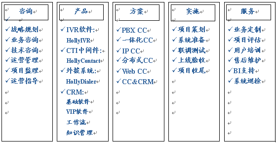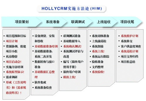 HOLLYCRM(合力金橋軟件)公司是國內(nèi)最早從事呼叫中心應(yīng)用軟件開發(fā)與服務(wù)公司,在多年的實(shí)踐經(jīng)驗(yàn)基礎(chǔ)上形成了完整的“456”呼叫中心“項(xiàng)目實(shí)施方法論”(HIM:HOLLYCRM Implementary Methodology),即“四大實(shí)施策略、五個項(xiàng)目階段、六大管理專題”。該體系的有效運(yùn)行對公司項(xiàng)目的成功上線和推進(jìn)軟件產(chǎn)品的成熟將起到至關(guān)重要的作用。