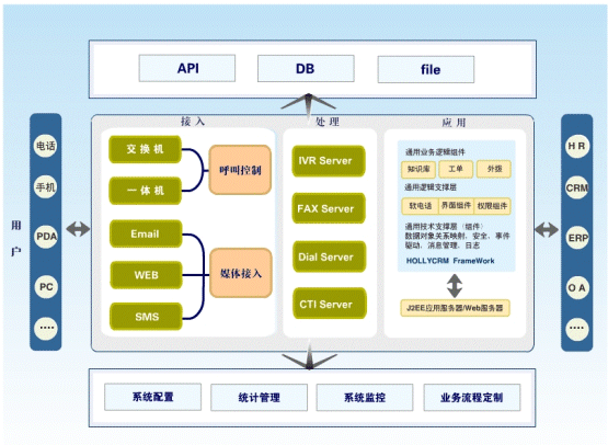 HollyC&C不僅支持電話、傳真、短信、Email、Web多媒體溝通渠道的統(tǒng)一接入和管理,還具有強(qiáng)大的業(yè)務(wù)整合接口,能夠幫助企業(yè)實(shí)現(xiàn)呼叫中心與企業(yè)其它信息系統(tǒng):如辦公OA、ERP、SCM、財務(wù)等系統(tǒng)的接口和工作流程整合。