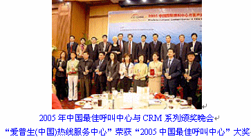 中國(guó)國(guó)際呼叫中心與客戶(hù)關(guān)系管理大會(huì)(ICC CHINA 2005)主辦的"中國(guó)最佳呼叫中心"的評(píng)選活動(dòng)中,"愛(ài)普生(中國(guó))熱線(xiàn)服務(wù)中心"憑借著自建成以來(lái)顯著改進(jìn)并提升了公司運(yùn)營(yíng)管理水平及客戶(hù)滿(mǎn)意度,并且在很大程度上增加了由呼叫中心直接或間接為企業(yè)帶來(lái)利潤(rùn)的絕對(duì)優(yōu)勢(shì),從而榮獲此殊榮。