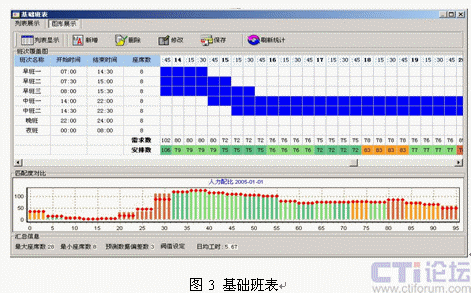 引入呼叫中心排班系統(tǒng)是提升坐席資源利用率的有效解決方案,排班系統(tǒng)可以對大量的歷史呼叫數(shù)據(jù)進行分析,并剔除特殊事件對呼叫量的影響,從而得出呼叫量變化的規(guī)律曲線,再輔助對特殊預(yù)期事件影響度的疊加,可以對未來一定時間的呼叫量變化做出比較客觀的預(yù)測(圖2)。在預(yù)測話務(wù)量變化曲線的同時,結(jié)合人員技能和班次設(shè)定,給出高擬合度的人工排班方案(圖3)。更為重要的是,成熟排班系統(tǒng)提供的話務(wù)預(yù)測模型多具備學(xué)習(xí)能力,能夠?qū)㈩A(yù)測的話務(wù)數(shù)據(jù)與實際話務(wù)數(shù)據(jù)進行對比,從而不斷提高話務(wù)預(yù)測模型的預(yù)測精度。成熟排班工具可以在保持呼叫中心同等服務(wù)水平的前提下,降低人工坐席代表的投入數(shù)量,進而釋放部分人工資源開展其它業(yè)務(wù)。