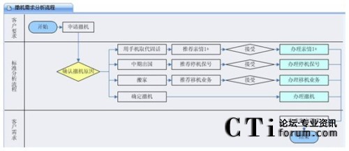 客戶呼入之后,座席人員要做的第一件事情就在IT系統(tǒng)的支持下先去捕獲客戶訴求,不用擔(dān)心座席會混淆相似的業(yè)務(wù)類型,因為呼叫中心針對典型的業(yè)務(wù)訴求會做出非常詳盡的引導(dǎo)流程,相似的或者關(guān)聯(lián)的業(yè)務(wù)類型在此流程中會體現(xiàn)出來,座席人員可以點(diǎn)擊,快捷地出入于各業(yè)務(wù)類型的引導(dǎo)圖,通過比較、判斷,最終定位出客戶真正訴求。例如下文客戶呼入本來想做“撤機(jī)”業(yè)務(wù),通過業(yè)務(wù)引導(dǎo)圖,最終定位到了客戶的真正訴求,辦理了停機(jī)保號業(yè)務(wù)或者移機(jī)業(yè)務(wù)。