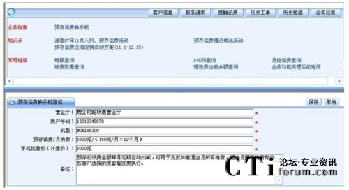 要實現(xiàn)此目的,IT支撐系統(tǒng)將高技能座席的處理能力“推送”給普通座席。第一章我們論述了IT支撐系統(tǒng)可以以客戶應(yīng)用場景為核心,通過分析流程分析客戶訴求找到客戶真正的需求?梢詫⑦@一思路推演下去,針對客戶的某個具體需求,呼叫中心制定統(tǒng)一的解決方案。我們以下面的“預(yù)存話費(fèi)換手機(jī)”為案例。通過先期溝通,座席已經(jīng)知曉這是客戶的真正訴求,只需要選擇好“預(yù)存話費(fèi)換手機(jī)”的業(yè)務(wù)類型,IT支撐系統(tǒng)會顯示出集成在一個頁面中的全套解決方案:處理此訴求可能用到知識庫中的三個知識點(diǎn);需要查詢的客戶信息,經(jīng)常給客戶發(fā)送的短信內(nèi)容;處理此訴求可能執(zhí)行的登記任務(wù),……