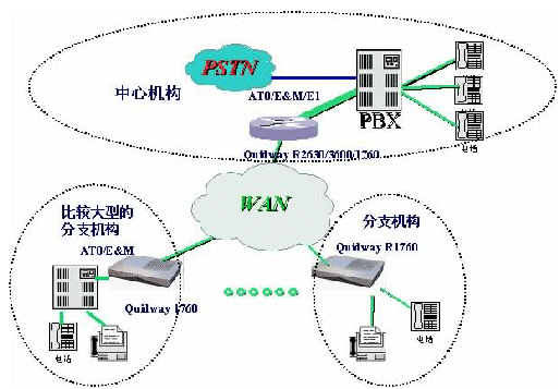 。。如圖是一個(gè)典型的企業(yè)網(wǎng)IP電話組網(wǎng)方案,在總部采用Quidway®R3640E/3680E路由器作為中心語(yǔ)音網(wǎng)關(guān)設(shè)備,在E1線路上實(shí)現(xiàn)VoIP功能;如果機(jī)構(gòu)規(guī)模不是很大,也可以采用AT0/E&M連接PBX;在各分支機(jī)構(gòu)及網(wǎng)點(diǎn),則可采用Quidway®