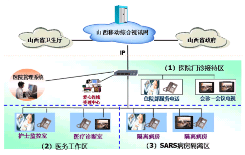 。。山西移動通信公司在獲悉遠(yuǎn)程視訊業(yè)務(wù)可以有效預(yù)防SARS的情況下,隨即與山西省政府、省衛(wèi)生廳通電話,表達(dá)了山西移動愿意為山西防治SARS工作提供更先進(jìn)的通信技術(shù)支持。山西移動與華為技術(shù)有限公司旋即制定了“愛心連線”遠(yuǎn)程醫(yī)療、遠(yuǎn)程探視實(shí)施方案,省衛(wèi)生廳及下屬太原市7家醫(yī)院要求盡快實(shí)施。目前該系統(tǒng)已經(jīng)在山西省山大第一醫(yī)院開通,正值國家衛(wèi)生部SARS督察小組在山西各大醫(yī)院視察“防非”工作,整個系統(tǒng)運(yùn)行穩(wěn)定,在SARS的防治工作中發(fā)揮了重要作用。