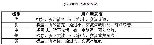 MOS(MeanOpinionScore)是一種常用的主觀評價標準。IP電話業(yè)務的MOS定義為四級:4.0-5.0(優(yōu))、3.5-4.0(良)、3.0-3.5(中)、1.5-3.0(差)、0-1.5(劣)。用戶滿意度和MOS等級的對應關(guān)系見表2。