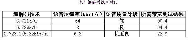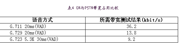 為進一步節(jié)省帶寬,又采用語音激活檢測技術(shù)(VAD)及舒適噪音生成(CNG)技術(shù),VAD技術(shù)只有當檢測到語音處于活動狀態(tài)時,編碼器的輸出信號才被送到網(wǎng)絡上,因此節(jié)省了帶寬。而在靜音時段采用CNG技術(shù),生成與背景噪聲相匹配的較舒適的靜音,避免了用戶有不自然的交談感覺,保證通話質(zhì)量。實際測試結(jié)果如表4,采用G.72920ms打包+VAD技術(shù)節(jié)省了近75%的帶寬。