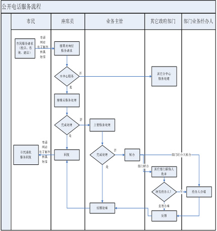 后臺處理座席員根據(jù)業(yè)務(wù)知識、資料庫和管理職責(zé)為市民服務(wù),如果不能處理,將請求提交相關(guān)政府部門并限時處理;