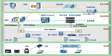 華為IPTV城域網(wǎng)解決方案,由業(yè)務支撐系統(tǒng)、內(nèi)容網(wǎng)絡系統(tǒng)、骨干承載網(wǎng)、接入網(wǎng)絡幾個部分組成。業(yè)務支撐系統(tǒng)和內(nèi)容網(wǎng)絡系統(tǒng)實現(xiàn)業(yè)務的管理和提供;網(wǎng)絡層和接入網(wǎng)以及用戶端設備配合完成業(yè)務的接入、控制、管理、QOS保障和安全。