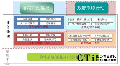 在架構(gòu)設(shè)計(jì)上,從電話接入、辦件流程、資料庫管理、信息維護(hù)到報(bào)表統(tǒng)計(jì)都實(shí)現(xiàn)了一體化設(shè)計(jì)理念。以業(yè)務(wù)流程設(shè)計(jì)為例,針對市民來電中的咨詢類的問題,12345政府熱線將直接由前臺接聽人員利用各部門預(yù)先錄入資料庫中的規(guī)范答案來回答市民的提問;對市民反映、建議、投訴類的來電,則由前臺記錄后轉(zhuǎn)給市信訪辦的后臺工作人員處理。一整套開放性的工作流和穩(wěn)定的技術(shù)后臺支持確保了市民可以在規(guī)定的時間內(nèi)得到政府的權(quán)威處理與回復(fù)。