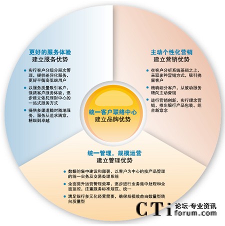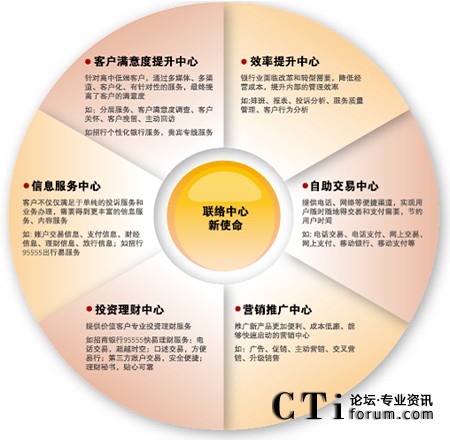 對于銀行業(yè)來說,聯(lián)絡(luò)中心已經(jīng)成為為客戶提供優(yōu)質(zhì)、快捷的金融理財服務(wù)的第二窗口。隨著電子化建設(shè)的不斷深入,寬帶、Internet和3G時代帶來的IP融合,聯(lián)絡(luò)中心為金融服務(wù)帶來了更廣泛的創(chuàng)新,未來的銀行聯(lián)絡(luò)中心將為客戶提供的金融服務(wù)趨于無所不能。銀行聯(lián)絡(luò)中心已經(jīng)成為自助交易中心、投資理財中心、營銷推廣中心和信息服務(wù)中心,借助聯(lián)絡(luò)中心,銀行與客戶可以隨時隨地建立緊密的多媒體互動,提升客戶滿意度和服務(wù)效率。