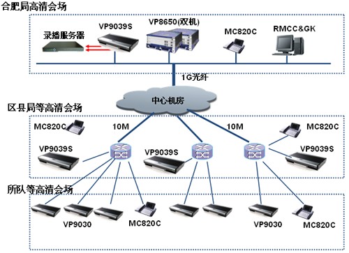 為滿(mǎn)足安徽省煙草合肥市公司日常工作會(huì)議、集中培訓(xùn)、遠(yuǎn)程匯報(bào)等工作業(yè)務(wù)需求,同時(shí)為應(yīng)對(duì)突發(fā)事件提供可靠可行的交互平臺(tái),實(shí)現(xiàn)多地點(diǎn)、遠(yuǎn)距離的視頻、音頻和數(shù)據(jù)的互通交流。深圳市金華威數(shù)碼科技有限公司工程師建議新建的視訊系統(tǒng)采用高清的視頻會(huì)議組網(wǎng)模式,其中市局、三縣與區(qū)局、所隊(duì)及營(yíng)銷(xiāo)部所有會(huì)場(chǎng)節(jié)點(diǎn)建設(shè)高清視頻會(huì)議系統(tǒng)。