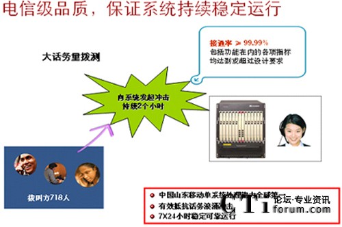 華為聯(lián)絡(luò)中心系統(tǒng)具有高穩(wěn)定性、高可靠性、易擴展性和可維護性。這主要源于華為對電信網(wǎng)絡(luò)現(xiàn)狀與演進的理解,源于華為擁有固定、移動和IP三個網(wǎng)絡(luò)方面綜合實力。華為數(shù)以千計的核心平臺開發(fā)測試人員,幾十種極端環(huán)境(如超大話務(wù)量、溫差、濕度、鹽堿度、缺氧等),磨礪出的是世界級的高品質(zhì)。麥加朝圣10KM內(nèi)密集200萬移動用戶,大部分為國際漫游,整齊劃一的用戶行為,形成連日多波話務(wù)尖峰,網(wǎng)絡(luò)受不均衡沖擊,系統(tǒng)容易雪崩。使用華為方案STC連續(xù)四年征服HAJJ期間話務(wù)高峰,告別系統(tǒng)每逢朝圣就癱瘓歷史。正是繼承了這樣的DNA,我們在某移動運營商聯(lián)絡(luò)中心系統(tǒng)單點實測BHCC1200K,每天平均呼叫量為600萬次,一套系統(tǒng)支撐著2000多座席和近8000路IVR。