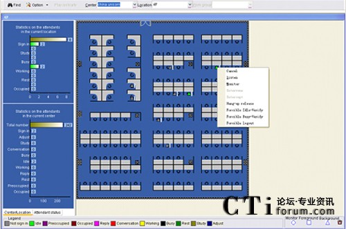系統(tǒng)提供一整套管理工具,輔以圖形化的人性設(shè)計(jì),將復(fù)雜的設(shè)備維護(hù)和系統(tǒng)優(yōu)化簡化為簡單的圖形管理,降低了維護(hù)難度和對(duì)維護(hù)人員的要求,提高了維護(hù)效率,使聯(lián)絡(luò)中心更為穩(wěn)定可靠地運(yùn)行。座席地圖按真實(shí)座席位置展現(xiàn)座席狀態(tài),使業(yè)務(wù)代表服務(wù)質(zhì)量的監(jiān)控和檢查更為形象高效,有利于提升業(yè)務(wù)代表服務(wù)質(zhì)量。