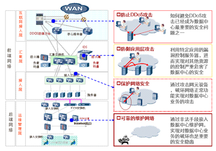 隨著各種黑客工具的推陳出新,數(shù)據(jù)中心面臨的安全威脅越來(lái)越大。數(shù)據(jù)中心網(wǎng)絡(luò)的安全必須從多個(gè)維度進(jìn)行設(shè)計(jì)。
