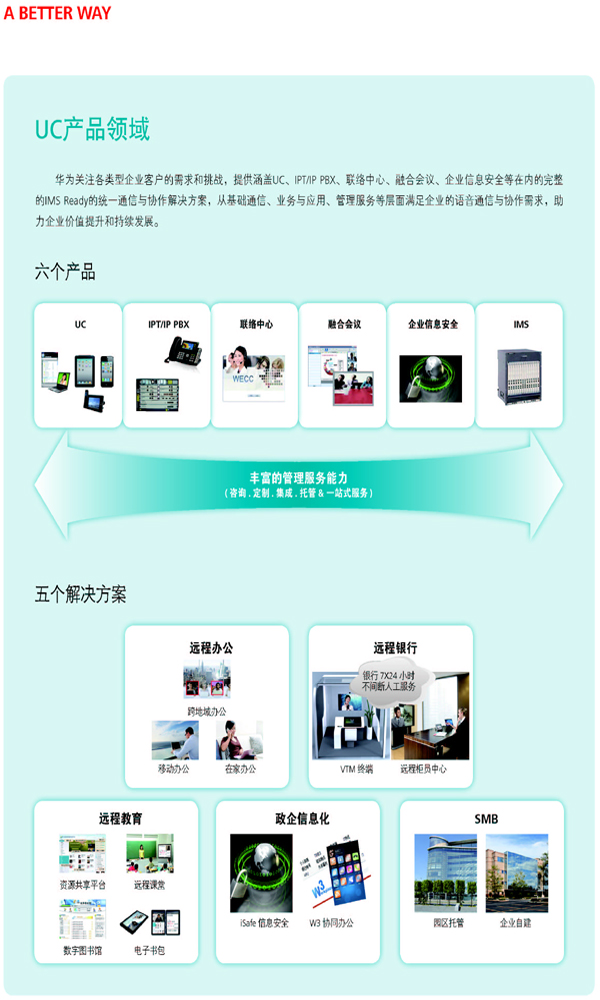 華為企業(yè)業(yè)務是華為三大業(yè)務集團之一。依托華為強大的研發(fā)和綜合技術能力,我們在企業(yè)業(yè)務領域與合作伙伴開放合作,理解客戶所需,致力于為全球政府及公共事業(yè)、金融、交通、電力、能源、商業(yè)企業(yè)及互聯(lián)網(wǎng)等行業(yè)以及大中小企業(yè)客戶提供全面、高效的ICT解決方案和服務,包括IP基礎網(wǎng)絡、統(tǒng)一通信與協(xié)作、云計算與數(shù)據(jù)中心等。