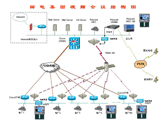 128,集團(tuán)下屬60個(gè)電廠(chǎng)均采用視頻終端ViewStation 128。整個(gè)網(wǎng)絡(luò)采用Polycom MCU的混速功能,在本部中心采用768Kbps進(jìn)行視頻傳輸,和下屬60個(gè)電廠(chǎng)及分公司采用128Kbps進(jìn)行傳輸。由于網(wǎng)絡(luò)傳輸線(xiàn)路分為衛(wèi)星線(xiàn)路和地面有線(xiàn)網(wǎng)絡(luò),衛(wèi)星線(xiàn)路帶寬為768Kbps-1Mbps,用于業(yè)務(wù)下行線(xiàn)路,地面有線(xiàn)網(wǎng)絡(luò)128Kbps用于視頻回傳。根據(jù)網(wǎng)絡(luò)傳輸線(xiàn)路的實(shí)際情況,在本部中心利用1臺(tái)視頻終端將其模擬信號(hào)(AV信號(hào))送到衛(wèi)星端接設(shè)備(包含MODEM,編解碼器等),將模擬信號(hào)轉(zhuǎn)換成數(shù)字信號(hào)(MPEG4),利用768K-1Mbps衛(wèi)星線(xiàn)路廣播到每個(gè)接收點(diǎn),通過(guò)每個(gè)接收點(diǎn)的編解碼器將數(shù)字信號(hào)轉(zhuǎn)換成模擬信號(hào)連接到顯示終端(如TV、顯示器)上進(jìn)行收看,通過(guò)這種方式可以實(shí)現(xiàn)利用衛(wèi)星線(xiàn)路的高帶寬,并利用其廣播特性,節(jié)省投資。