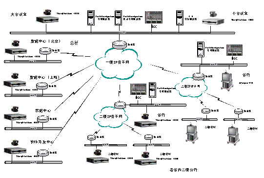 為進一步強化企業(yè)內部的集約化管理,中國工商銀行決定部署IP視頻會議網(wǎng)。要求該系統(tǒng)基于寬帶通信網(wǎng)絡,建立起工行總行與下屬各單位間的視頻聯(lián)系,提供語音、圖像和演示的交互,從而實現(xiàn)二級分行以上的視頻會議系統(tǒng)。同時,總行通過視頻會議可以加強對下屬單位的有效控制和業(yè)務管理、實現(xiàn)高效辦公、減少會議開支,而且通過多媒體交互技術,實現(xiàn)直觀、可靠、便捷的會議效果,為今后逐步實現(xiàn)工行扁平化管理提供安全、便利和快捷的技術基礎。另一方面,各分會場可以通過該系統(tǒng)提高工作效率,進行交互式的技術培訓、技術方案探討等工作。