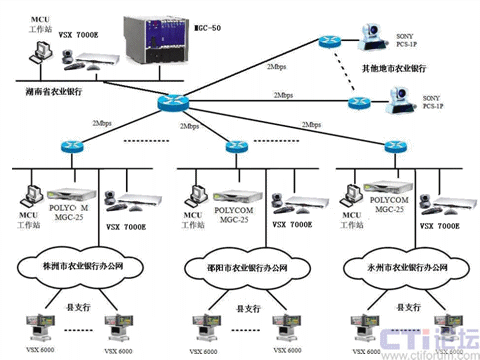 在株洲、邵陽和永州市行采用級(jí)聯(lián)的方式來實(shí)現(xiàn)。具體實(shí)現(xiàn)方式為:VSX 7000E則和地市行的MGC-25通訊,并且MGC-25負(fù)責(zé)其縣支行終端的接入,同時(shí)用MGC-50和MGC-25的端口級(jí)聯(lián),采用這種連接方式就可以實(shí)現(xiàn)從省行-地市行-縣支行的三級(jí)網(wǎng)視頻會(huì)議的召開。