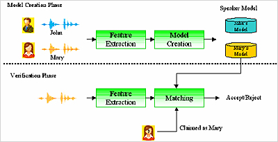 而語者驗(yàn)證(Speaker Verification)技術(shù),如下圖所示,我們亦可稱之為語者認(rèn)證(Speaker Authentication)或是語者偵測(Speaker Detection),主要是用來鑒定一已知身份的說話者其宣稱之身份的真實(shí)性,利用擷取說話者的聲紋特征,我們可以從事先儲存的語者聲紋資料庫中,取出該宣稱身份的語者聲紋模型,并且和說話者輸入的聲音做比對,由于系統(tǒng)會先獲知該使用者表明的身份(如小美),所以這會造成兩種可能的判斷錯(cuò)誤,其中一種是錯(cuò)誤接受(False Accept),即說話者為一冒充者(Imposter)但被系統(tǒng)誤認(rèn)為其所宣稱的身份,另外一種是錯(cuò)誤拒絕(False Reject),即系統(tǒng)將真實(shí)身份的說話者誤判為冒充者。