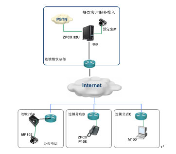 在總部選用ZPCX32U作為系統(tǒng)核心平臺,提供中繼接入和總部辦公電話分機,內置IVR等擴展功能,作為該企業(yè)統(tǒng)一接入門戶和組網核心平臺。