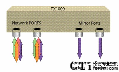 與TX100相同,將TX1000直接高阻搭接在網(wǎng)絡(luò)中的任何位置,兩個Network端口高阻搭接在主干網(wǎng)上,另兩個端口Monitor A和Monitor