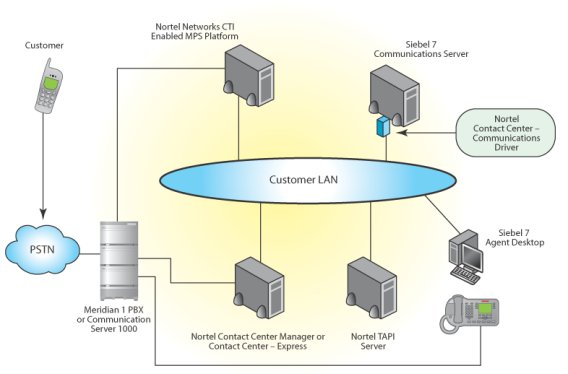 PBXX或通信服務器1000、北電聯(lián)絡中心管理器或快速聯(lián)絡中心、北電TAPI服務器、Siebel7座席桌面系統(tǒng)