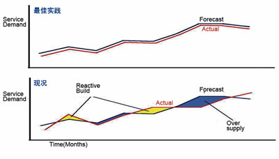 下一代網(wǎng)絡(luò)的IP化、智能化的趨勢(shì),使得服務(wù)路徑從靜態(tài)路由為主向動(dòng)態(tài)化、共享化轉(zhuǎn)變。這種轉(zhuǎn)變使得主動(dòng)的網(wǎng)絡(luò)容量規(guī)劃在下一代運(yùn)營環(huán)境中具有更加重要的意義。準(zhǔn)確、真實(shí)、主動(dòng)的網(wǎng)絡(luò)容量計(jì)劃和趨勢(shì)分析能力將成為對(duì)OSS解決方案的關(guān)鍵需求。網(wǎng)絡(luò)規(guī)劃不僅可以幫助運(yùn)營商準(zhǔn)確分配網(wǎng)絡(luò)容量,而且可以減少容量不足和失敗訂單,并可通過找出利用率不足的網(wǎng)絡(luò)資源來提高網(wǎng)絡(luò)運(yùn)行效率,如圖3所示。
