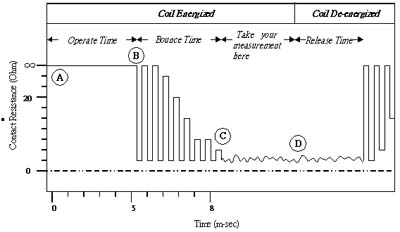 1) Operate Time:驅(qū)動電路推動繼電器直至開關(guān)第一次閉合的時間,為A-B區(qū)段。