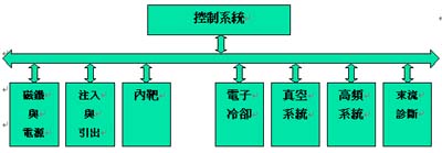 同步輻射設(shè)備以系統(tǒng)分類可分為磁鐵系統(tǒng)、電源系統(tǒng)、高頻系統(tǒng)、注入與引出系統(tǒng)、電子冷卻系統(tǒng)、內(nèi)靶系統(tǒng)、真空系統(tǒng)、束流診斷系統(tǒng)、控制系統(tǒng)、準直與測量系統(tǒng)。系統(tǒng)架構(gòu)圖如下: