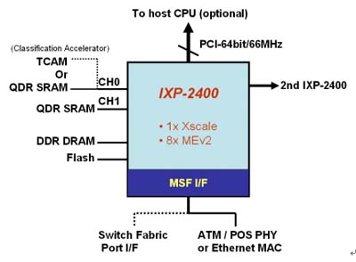 圖一是IXP-2400示意圖外觀,它有兩個信道的QDR