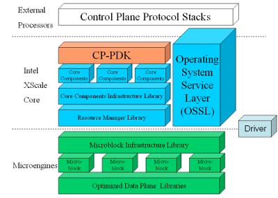 Intel 建立了IXA 軟件可攜式架構,讓今天花力氣辛辛苦苦在IXP-2400建立起來的軟件,明天在下一代IXP-2XXX仍然適用,而這個軟件架構可以簡單用圖三表示。