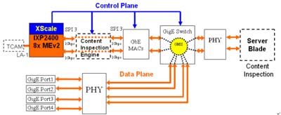 Inspection),表頭辨識系針對其流向、連結、輸入端口及目的地址等做比對;內容檢查則有復雜的算法,處理頻寬及內存容量需求極高,很顯然內容檢查即將是此系統(tǒng)非常嚴重的交通瓶頸所在,這個運算將耗用大量IXP-2400網(wǎng)絡處理器的運算資源。因此必須采用另一個處理器卸載此運算,有兩種方法可行,其一是如圖四:加入一顆個可程序內容檢查引擎(Programmable
