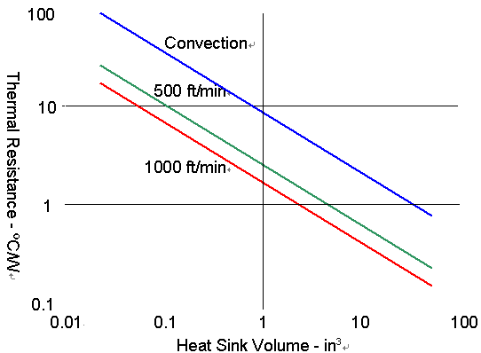 從圖上可以看出散熱片的散熱能力并不和風(fēng)速成一線性函數(shù),在熱阻上一個(gè)非常顯著的改善,會(huì)在稍呈對(duì)流狀態(tài)的空氣與每分鐘500英尺的風(fēng)速情況下顯現(xiàn)出來,但是從每分鐘500英尺增加到每分鐘1000英尺的風(fēng)速時(shí),熱阻的改善就沒那么顯著了。另一個(gè)用吹風(fēng)方式的限制因素是噪音,當(dāng)吹過卡板與散熱片的風(fēng)速增加時(shí),所產(chǎn)生的噪音也會(huì)增加。從實(shí)務(wù)面來看,大部分的CompactPCI機(jī)箱提供每分鐘300英尺的風(fēng)速,如先前提到的,散熱片通常會(huì)被內(nèi)存以及PMC的空間給限制了大小,一個(gè)CompactPCI卡板若含有兩個(gè)PMC的設(shè)計(jì),通常會(huì)有一個(gè)處理器散熱片的大小約為3