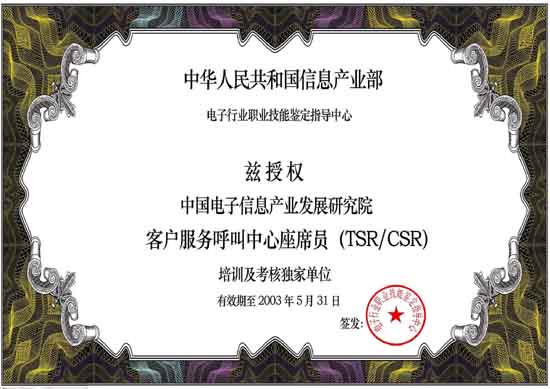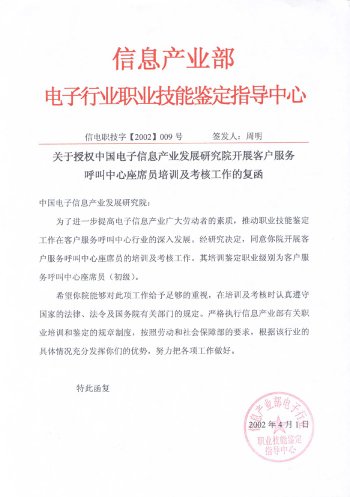 中國電子信息產(chǎn)業(yè)發(fā)展研究院職業(yè)技能培訓部是中國電子信息產(chǎn)業(yè)發(fā)展研究院旗下專業(yè)從事IT職業(yè)技能培訓的機構(gòu)。呼叫中心職業(yè)技能培訓工作是培訓中心常年開展的主要培訓項目。培訓中心受信息產(chǎn)業(yè)部委托,負責全國范圍內(nèi)"呼叫中心客戶服務座席員"的授權(quán)培訓及考核工作。既是呼叫中心行業(yè)基礎(chǔ)操作人員培訓及考核的權(quán)威機構(gòu),又是配合行業(yè)管理、全面支撐和提升整個呼叫中心產(chǎn)業(yè)的服務機構(gòu)。