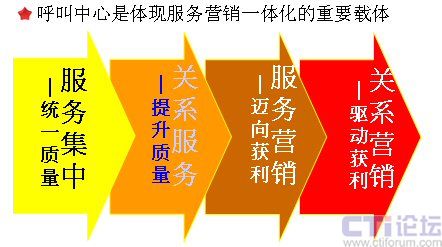 呼叫中心是體現(xiàn)服務(wù)營(yíng)銷一體化的重要載體。我在前面已經(jīng)說了,服務(wù)和營(yíng)銷一個(gè)是被動(dòng)一個(gè)是主動(dòng),一個(gè)inbound一個(gè)outbound,呼叫中心可以非常完整地將兩者融合到一起,它是一個(gè)非常重要的服務(wù)營(yíng)銷的載體。我們從呼叫中心整個(gè)營(yíng)銷策略的進(jìn)程當(dāng)中,可以看到非常明顯的四個(gè)階段: