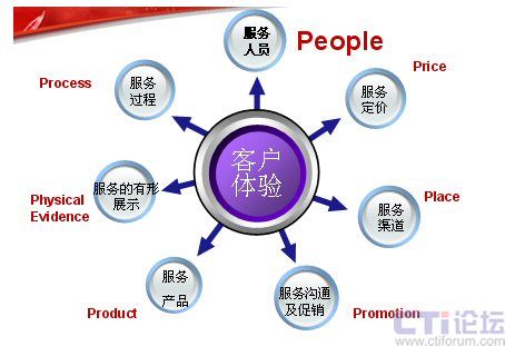 下面這張圖是服務(wù)營(yíng)銷的7P模型,在這里我認(rèn)為最應(yīng)該關(guān)注的是People——人。這里,我想引用世界經(jīng)理人刊登的一篇文章“影響中國(guó)的十大管理理念”上的一段文字:“邁向服務(wù)型經(jīng)濟(jì)實(shí)際上就是邁向人才經(jīng)濟(jì)。在制造業(yè)中,價(jià)值是由機(jī)器創(chuàng)造的。在服務(wù)業(yè)中,價(jià)值則是人創(chuàng)造的。”這也是在服務(wù)業(yè)中,要將“人”進(jìn)行體現(xiàn)。也許你不在乎為你制造產(chǎn)品的工人長(zhǎng)的美或丑,但為客戶服務(wù)的人員如果長(zhǎng)的很丑,對(duì)服務(wù)就會(huì)有一定的影響。大家只看產(chǎn)品結(jié)果,不關(guān)注過程,但是服務(wù)卻是與過程緊密的結(jié)合。