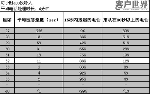然而,圖3從客戶感受的角度來分析問題。從客戶的角度來看,客戶聯(lián)絡中心提供的服務并沒有達到他們期望。對于每個來電者最首要的問題是要求在幾秒鐘內接通電話。如果所有的座席都忙碌,這種可能性就會大大降低了。如果在線座席代表數(shù)量不足,則平均排隊時間就會增加,這將導致客戶的不滿,進而將他們的業(yè)務轉向別處。