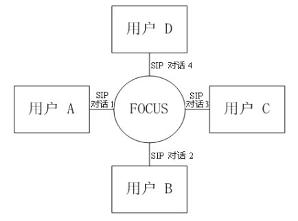 緊耦合會議的邏輯架構(gòu)圖如圖三所示。會議中的核心是“會議中心(conference focus)”,每一個(gè)會議都有一個(gè)會議中心,由一個(gè)URI標(biāo)識,用戶通過聯(lián)系這個(gè)URI參加到一個(gè)會議中去。會議中心和用戶之間的拓?fù)浣Y(jié)構(gòu)為星性結(jié)構(gòu)。會議中心為用戶提供并維持一個(gè)信令連接,并且可以執(zhí)行會議策略,實(shí)現(xiàn)對會議的控制和管理。