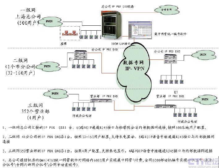 套Omni PCX Office(面向中小型機構的通信平臺)系統(tǒng)分別為4-160 用戶作為分支交換節(jié)點。全網(wǎng)總計多達6000