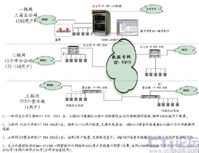 多個用戶,覆蓋1 個總公司、41 個分公司和352 個營業(yè)部。在設計組網(wǎng)方案時,阿爾卡特朗訊根據(jù)用戶的需求和實際情況,并充分考慮現(xiàn)有的數(shù)據(jù)網(wǎng)絡資源,提出采用星狀網(wǎng)絡組網(wǎng)結構建設PBX