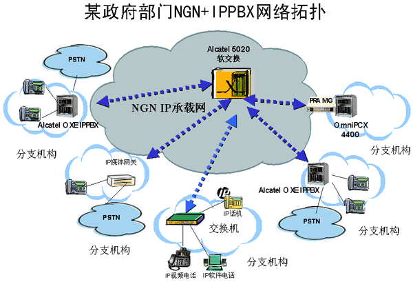 上海貝爾阿爾卡特提出的用NGN整合IP PBX的解決方案,在政府、郵政、酒店、跨國企業(yè)等領(lǐng)域得到了很多成功的應(yīng)用,下面以國家政府某部門的部署方案為例來詳細(xì)介紹NGN+IP