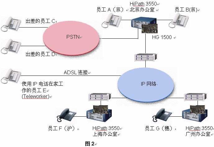 西門子推薦該公司每一個(gè)辦公室均采用HiPath 3550 PBX。如果,A公司每個(gè)辦公室已經(jīng)擁有DDN專線或ADSL連接至Internet,它就能將其內(nèi)部通信建設(shè)在現(xiàn)存的IP網(wǎng)絡(luò)的基礎(chǔ)之上。其集成網(wǎng)關(guān)HiPath 1500被用來連接數(shù)據(jù)網(wǎng)絡(luò)和語音網(wǎng)絡(luò)。在這樣的網(wǎng)絡(luò)架構(gòu)中,路由冗余能夠得到充足的保證,因?yàn)槲鏖T子HiPath解決方案提供了最大的網(wǎng)絡(luò)存活性:即使IP網(wǎng)絡(luò)出現(xiàn)故障,西門子網(wǎng)絡(luò)設(shè)置能夠?qū)⒙酚勺詣?dòng)切換至PSTN之上。