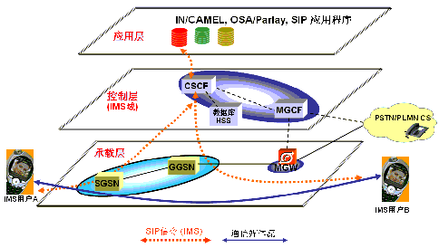 VPN等。圖中以移動分組網(wǎng)的承載方式為例,描述了IMS用戶通過手機進行IMS會話的方式,主要的承載層設(shè)備有SGSN、GGSN,以及媒體網(wǎng)關(guān)MGW。SGSN和GGSN可以完全重用現(xiàn)網(wǎng)設(shè)備,不需要硬件升級,僅通過做相關(guān)配置就可以支持IMS了。MGW是負責(zé)媒體流在IMS域和CS域互通的功能實體,主要解決話音互通問題。無論具體采用哪一種接入方式,只要基于IP技術(shù),所有的IMS用戶信令就可以很好地傳送到控制層。